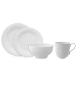 - Includes dinner plate, salad plate, cereal bowl and mug