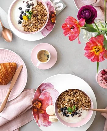 Rose Garden is inspired by the spring, when the sunlight hits the fresh greenery rosebuds. The design is highlighted by soft shades of pinks and reds stylized rose blossoms. Add watercolor florals to your home with Rose Garden. Villeroy Boch has been creating premium tableware since 1748.